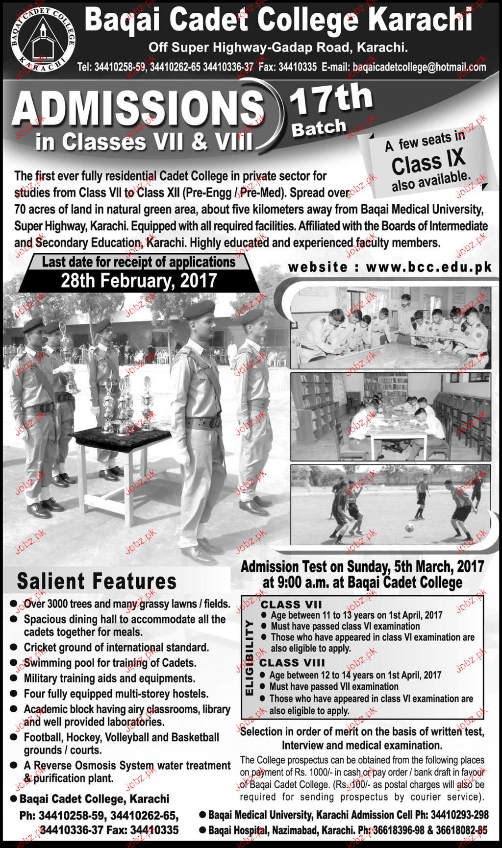 Baqai Cadet College Admission in Class VII and VIII in Karachi. Read newspaper ad for exact details.