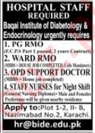 Baqai Institute of Diabetology & Endocrinology Karachi, karachi Sindh Pakistan invites applications from eligible candidates for the post of ward rmo, staff nurse, pg rmo and opd support doctor as per advertisement of February 25, 2024 published in daily Jang Newspaper. Preferred Education is Master, MBBS, Bachelor and Intermediate etc.