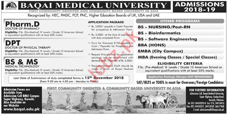 Baqai Medical University Karachi, Pakistan are started admissions for academic session 2018-2019 for the classes of Pharm D, DPT, BS Medial Technology, MS, BBA, EMBA, MBA. Read newspaper ad for exact details.