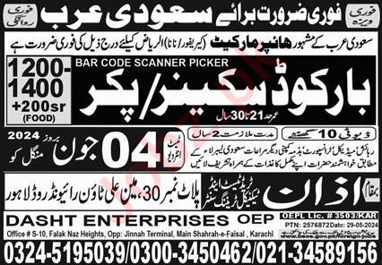 Dasht Enterprises Overseas Employment Promoters Riyadh, riyadh Saudi Arabia invites applications from eligible candidates for the post of picker and bar code scanner as per advertisement of June 2, 2024 published in daily Express Newspaper. Candidates with Matric and Intermediate etc. educational background will be preferred.