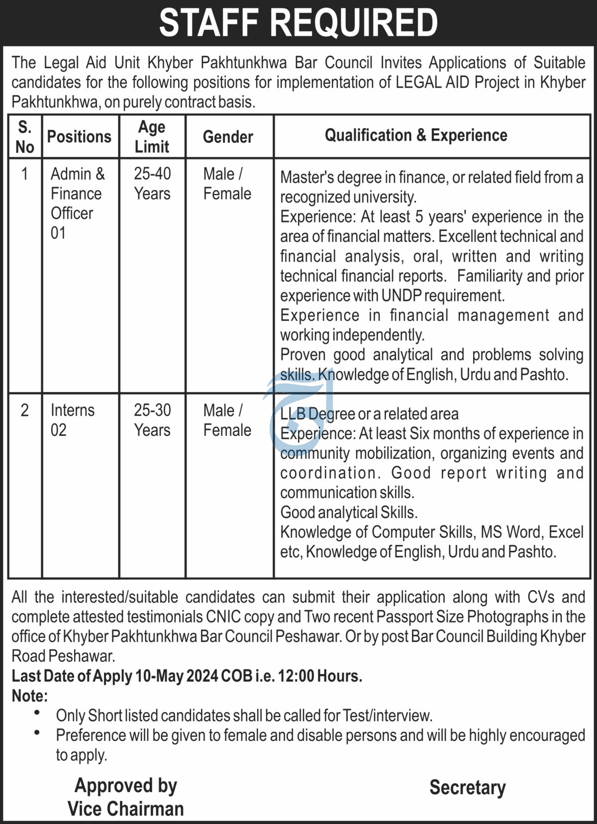 Bar Council is looking for candidates for following posts as per job advertisement published in daily Aaj Newspaper of May 8, 2024 for location Peshawar, peshawar Khyber Pakhtunkhwa KPK Pakistan: