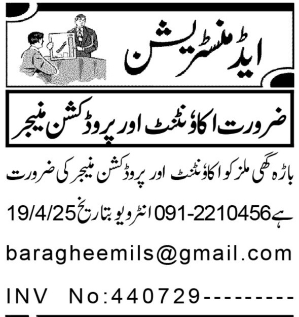 Ghee Mill Barra Chowk Peshawar, peshawar Khyber Pakhtunkhwa KPK Pakistan invites applications from eligible candidates for the post of accountant and production manager as per advertisement of April 19, 2025 published in daily Aaj Newspaper. Candidates with B.com, DAE, Bachelor and Intermediate etc. educational background will be preferred.
