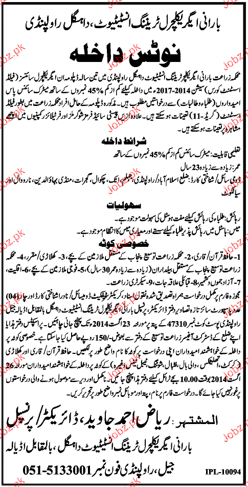 Barani Agriculture Institute Admission in Diploma in Rawalpindi. Read newspaper ad for exact details.