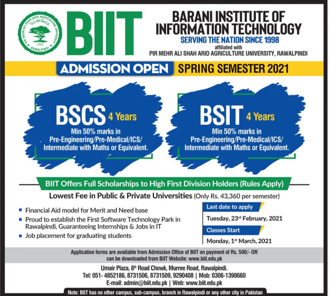 Barani Institute of Information Technology affiliated with Pir Mehr Ali Shah Arid Agriculture University has announced admissions in BSCS and BSIT 4 Years Degree Programs 2021. Read newspaper ad for exact details.