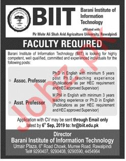 Vacancies in Barani Institute of Information Technology Advertisement August 2019
