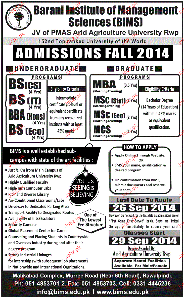 Barani Institute of Management Science Admission in BS, BBA, MSc and MCs in Rawalpindi. Read newspaper ad for exact details.
