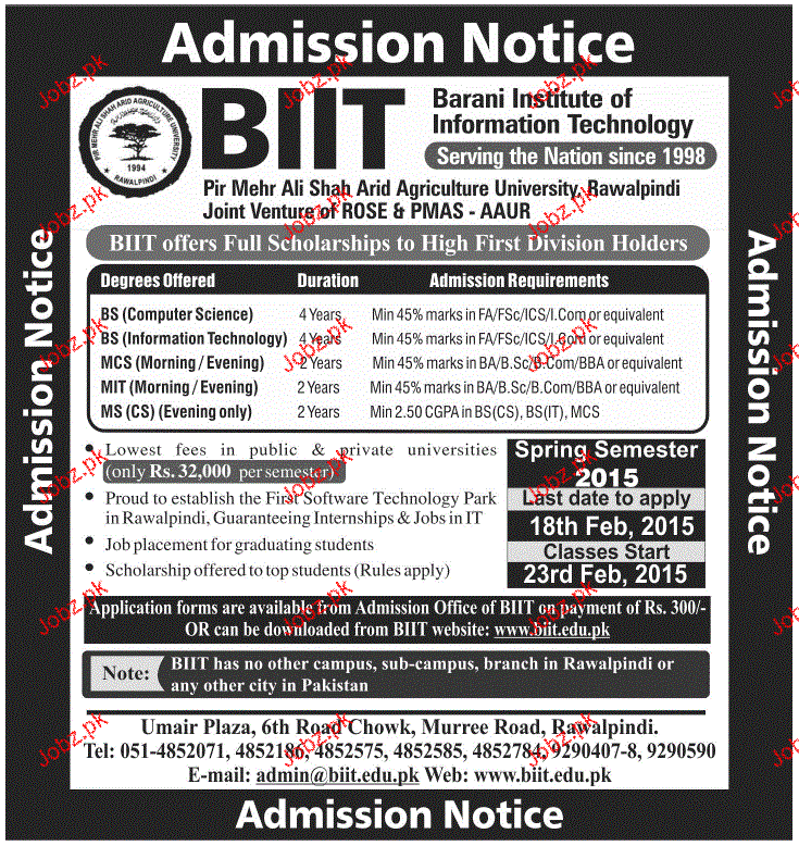 Barani Institute of Management Science Admission in BS, BBA and MIT in Rawalpindi. Read newspaper ad for exact details.