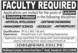 Barani Institute of Management Sciences BIMS invites applications from highly qualified and well experienced individuals for the posts of Artificial Intelligence Lecturer, Software Engineering Assistant Professor, Management Sciences Lecturer, Sociology Lecturer and Anthropology Lecturer in Rawalpindi.