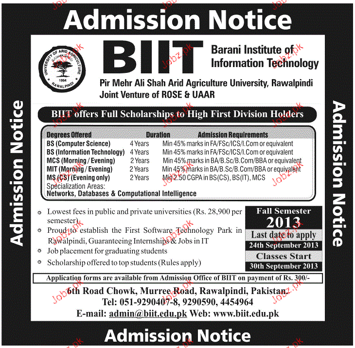 Barani Institute of technology Admission in BS and MIT in Rawalpindi Read newspaper ad for exact details.