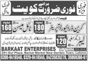 Barkat Enterprises Kuwait, kuwait Kuwait invites applications from eligible candidates for the post of labor, tile mason, crane operator and crane driver as per advertisement of June 17, 2025 published in daily Jang Newspaper. Preferred Education is Intermediate, Primary, Matric and Middle etc.