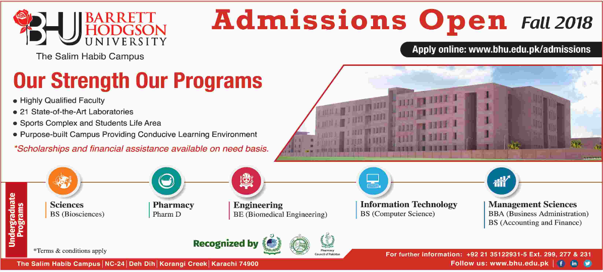 Barrett Hodgson University Karachi, Pakistan start admissions summer 2018 for the classes of BS Bio science, Pharm D, BE Biomedical Engineering, BS Computer Science and MBA. Read newspaper ad for exact details.
