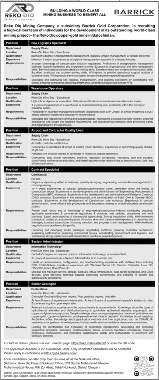 Vacant posts including airport contractor quality lead, geologist, contract specialist, ware house operator, system administrator and site logistics specialist are announced in Barrick Pakistan Chaghi, chaghi Balochistan Pakistan as per 19 September 2024 advertisement in daily Jang Newspaper. Educational qualifications required Master, MS and Bachelor etc.
