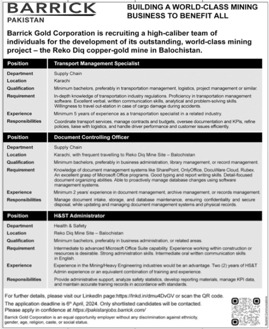 Reko Diq Mine Site, Barrick Pakistan Quetta, karachi Balochistan Pakistan invites applications from eligible candidates for the post of document controlling officer, h&st administrator and transport management specialist as per advertisement of March 30, 2024 published in daily Jang Newspaper. B.com, BBA and Bachelor etc. educational qualification will be preferred.