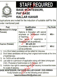 Base Montessori PAF Base Kallar Kahar jobs