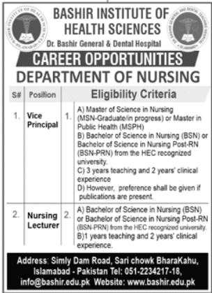 Bashir Institute Of Health Sciecnes Jobs 2021