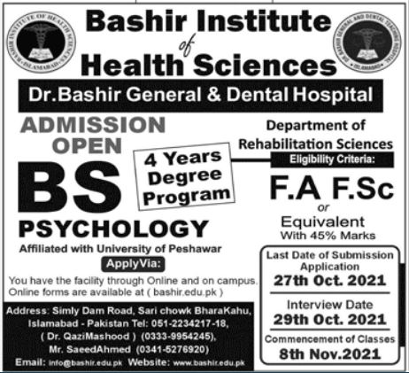 Bashir Institute of Health Sciences, Islamabad is a leading institute for health studies in Bharakahu, Islamabad is inviting applications for admissions in BS Psychology. Read newspaper ad for exact details.