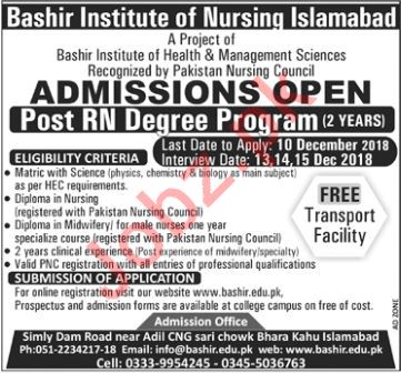 Bashir Institute of Nursing Islamabad, Pakistan are announced admissions spring 2019 for the classes of Post RN Degree Program. Last date of receipt of duly filled in application form is 10th Dec 2018. Read newspaper ad for exact details.