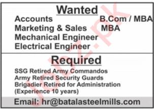 Batala Steel Lahore, lahore Punjab Pakistan invites applications from eligible candidates for the post of mechanical engineer, account staff, sales staff, electrical engineer and marketing staff as per advertisement of June 22, 2025 published in daily Jang Newspaper. Candidates with MS, MBA, Bachelor and Master etc. educational background will be preferred.