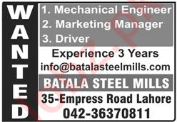 Batala Steel jobs advertisement dated about 1 September 2024 in daily Jang Newspaper invites application for the vacant post of mechanical engineer, marketing manager and driver in Lahore, lahore Punjab Pakistan. Educational qualifications required MS, Matric, Middle, Bachelor and Master etc.