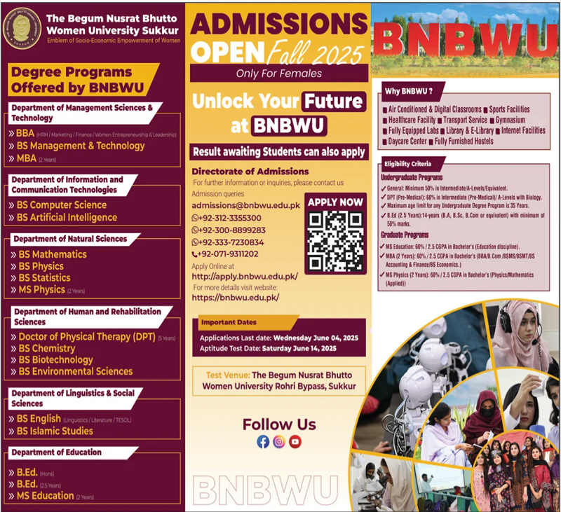 The Begum Nusrat Bhutto Women University BBA, MBA, BS, DPT admissions 2025 has been announced. The Begum Nusrat Bhutto Women University Sukkur Sindh Pakistan welcomes students to apply for admissions in academic year 2025 in Medical University. Eligible students for fulfilling criteria for admissions in can enroll as per Government admission policy 2025 till closing date. Read newspaper ad for exact details.