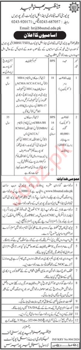 Benazir Bhutto Shaheed University of Technology & Skill Development Khairpur, khairpur Sindh Pakistan invites applications from eligible candidates for the post of chief accountant and accountant as per advertisement of March 31, 2024 published in daily Jang Newspaper. Master, MS and Bachelor etc. educational qualification will be preferred.