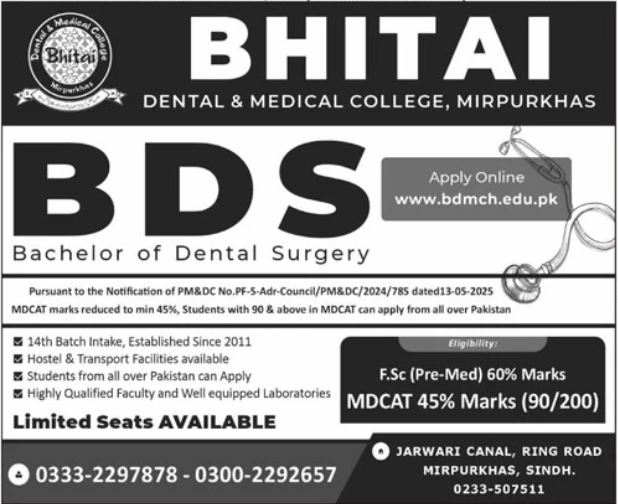 Admissions in Bhitai Dental & Medical College 2025 for BDS has been announced. Eligible students who qualify as per admission criteria in Bhitai Dental & Medical College Mirpur Khas Mirpur Sindh Pakistan can apply in Medical College for academic year 2025. Eligible candidates for admissions in can apply as per Government institute criteria and before closing date after reading advertisement online. Read newspaper ad for exact details.