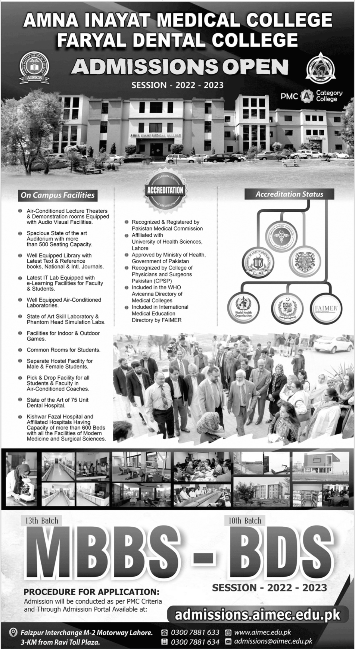 Admissions in Amna Inayat Medical College 2022 for BDS, MBBS has been announced. Students can enroll for admissions in Amna Inayat Medical College Lahore Punjab Pakistan for academic year 2022 to continue campus based or online education in Medical Medical College. Students who want to enroll for academic session 2022 in MBBS and BDS qualification and admission criteria for Private institute can apply till last date 27 December 2022. Read newspaper ad for exact details.