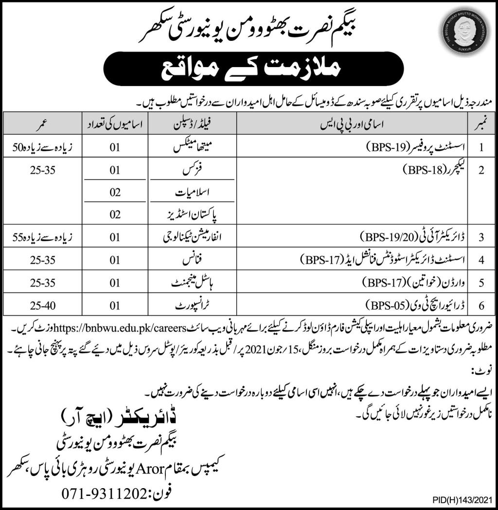 Begum Nusrat Bhutto Women University Sukkur Jobs 2021