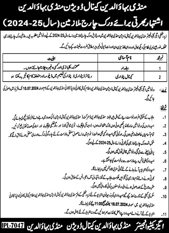 Irrigation Department Mandi Bahauddin, mandi bahauddin Punjab Pakistan invites applications from eligible candidates for the post of beldar and patwari as per advertisement of July 28, 2024 published in daily Express Newspaper. Candidates with Matric, Primary, Intermediate and Middle etc. educational background will be preferred.