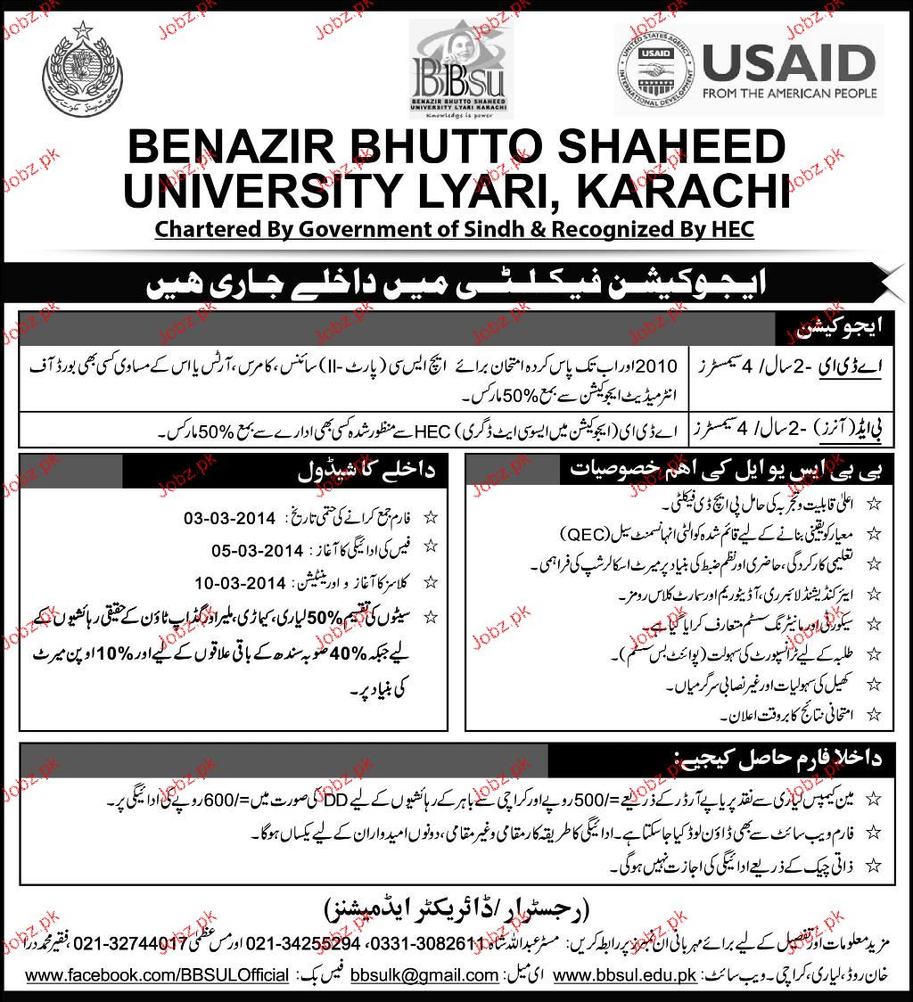 Benazir Bhutto Shaheed University Admission in BBS in Karachi Read newspaper ad for exact details.
