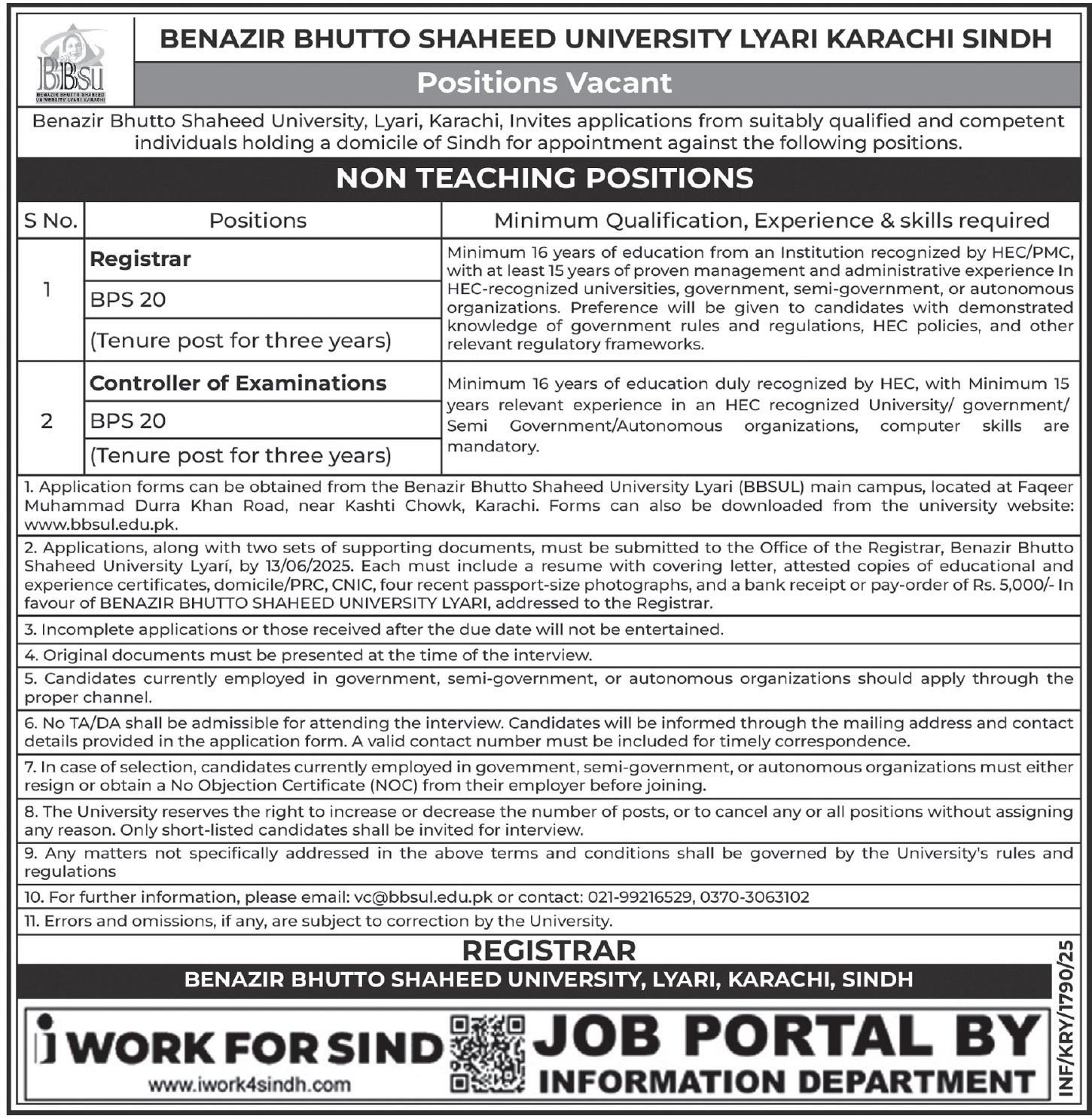 Benazir Bhutto Shaheed University Lyari BBSUL Lyari Town Karachi, karachi Sindh Pakistan invites applications from eligible candidates for the post of controller of examinations and registrar as per advertisement of June 3, 2025 published in daily Express Tribune Newspaper. Educational qualifications required Master etc.