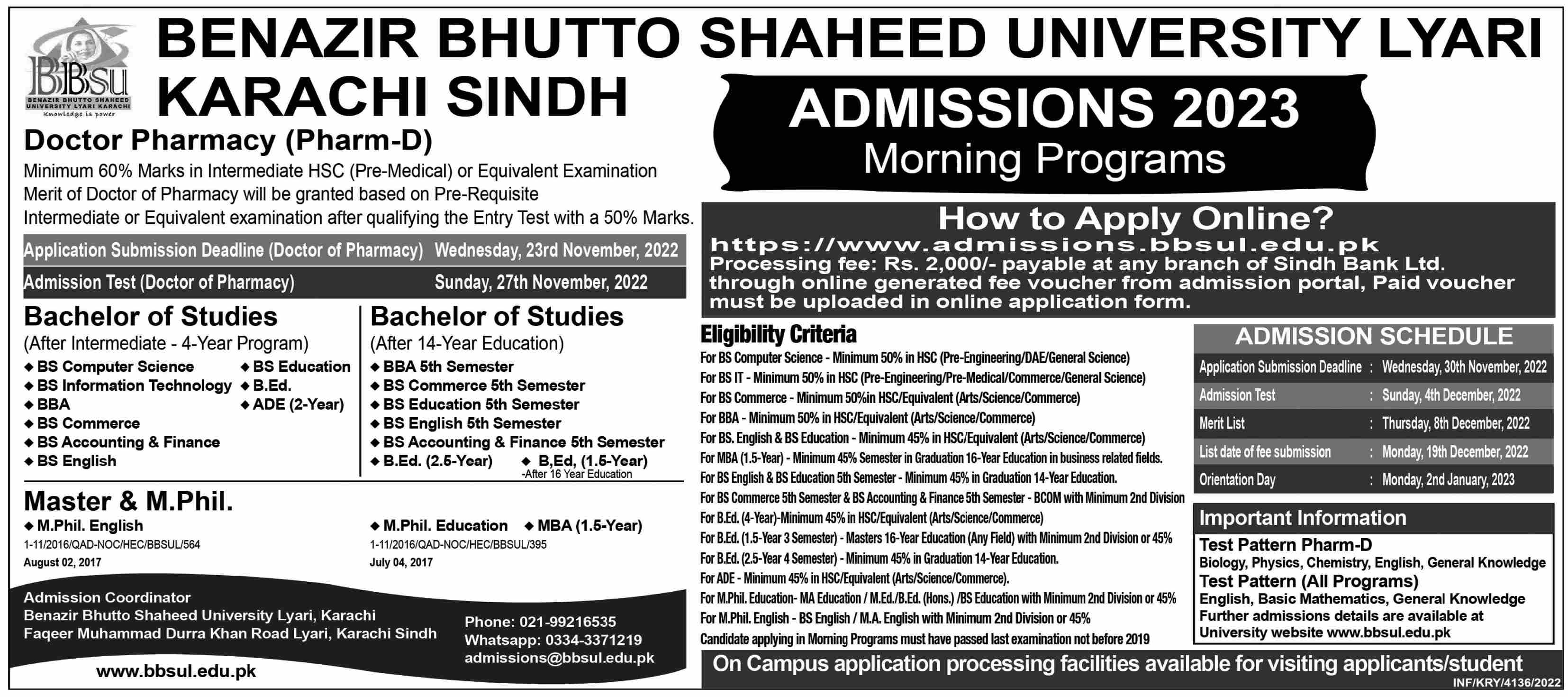Admissions in Benazir Bhutto Shaheed University 2022 for Doctor of Pharmacy Pharm D,BS Computer Science,BS IT,BBA,BS Commerce,BS Accounting and Finance,BS English,BBA 5th Semester,BS Commmerce 5th Semester,BS Education 5th Semester,BS Accounting and Finance 5th Semester,B.ED has been announced. Eligible students can apply for academic admissions 2022 in Benazir Bhutto Shaheed University Karachi Sindh Pakistan for Computer University. Students who want to enroll for academic session 2022 in BS and Bachelor qualification and admission criteria for Government institute can apply till last date 30 November 2022. Read newspaper ad for exact details.