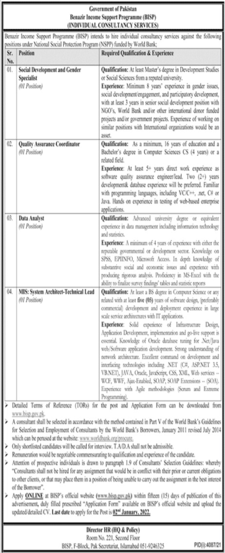 Benazir Income Support Programme BISP invites applications from highly educated expert and experienced professionals for the post of Special Development and Gender Specialist, Quality Assurance Coordinator, Data Analyst, MIS System Architect, Technical Lead in Islamabad.