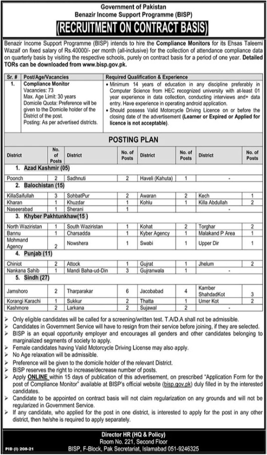 Vacancies in Benazir Income Support Programme BISP Advertisement July 2021