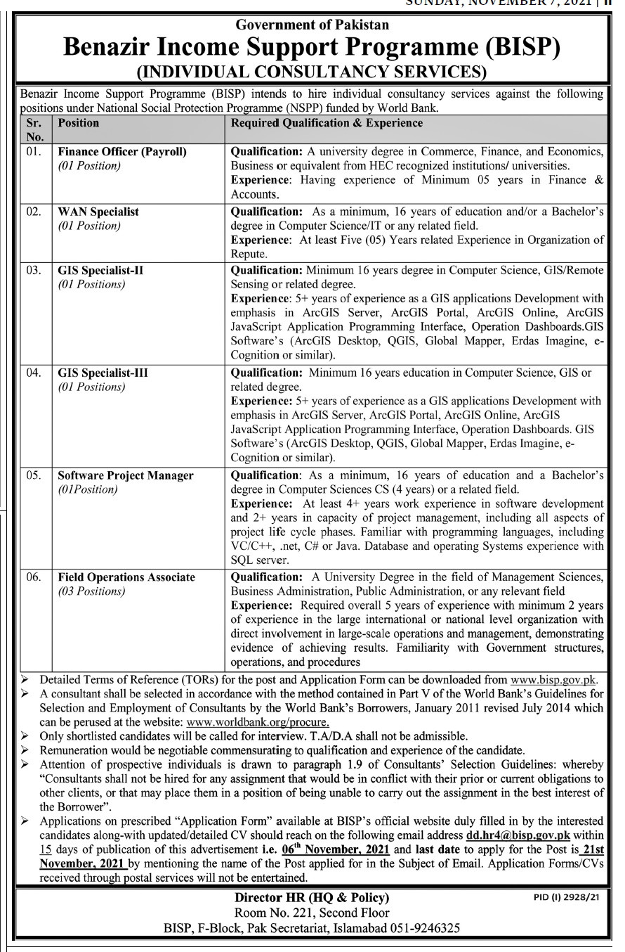 Vacancies in Benazir Income Support Programme BISP Advertisement November 2021