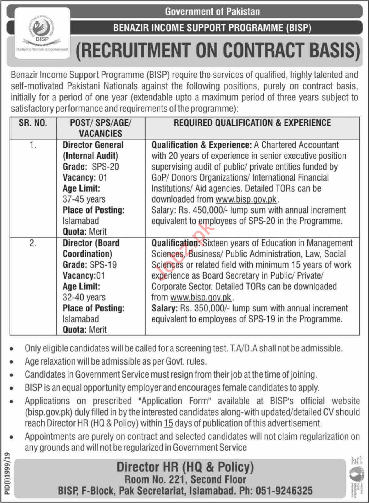Vacancies in Benazir Income Support Programme BISP Advertisement October 2019