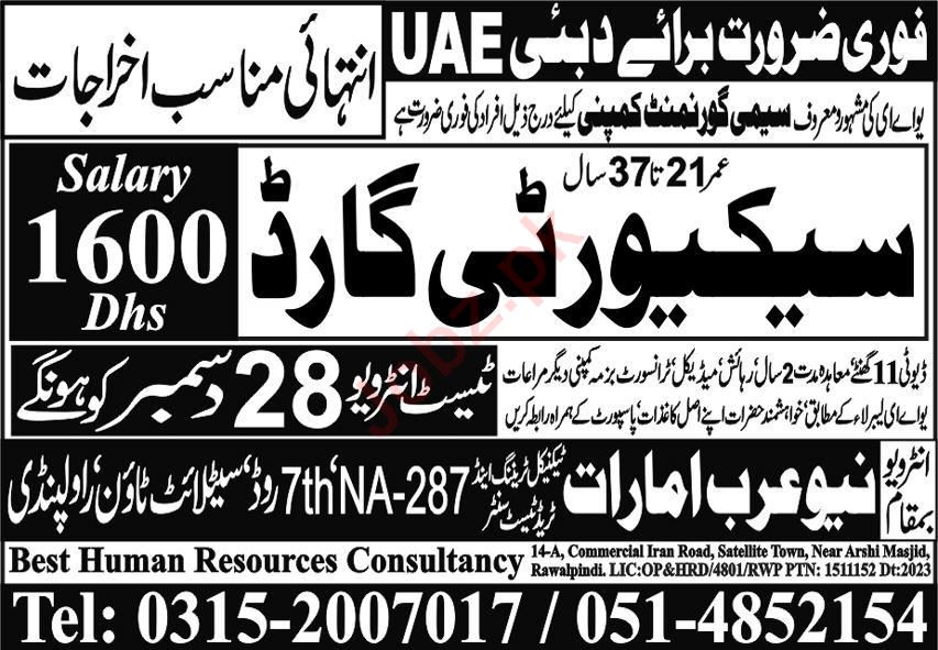 Best Human Resources Consultancy latest Overseas Security jobs and others can be applied till 28 December 2023 or as per closing date in newspaper ad. Read complete ad online to know how to apply on latest Best Human Resources Consultancy job opportunities. Facilities like accommodation, medical and transport may be provided.