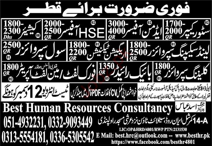 Best Human Resources Consultancy invites applications for job positions advertised in daily Express dated 10 December 2023 for following vacancies in Qatar, qatar Qatar.