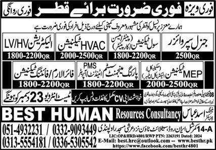 Vacant posts including Hvac Technician, Pms Operator, Electrical Technician, Pms Attendant, Fire Fighting Technician, Electrician Lv, Electrician Hv, Mep Technician, Parking Management System Operator, Painter, General Supervisor, Civil Technician, Mason, Carpenter, Fire Alarm Technician, Electrician, Plumber, Mechanical Technician and Parking Management System Attendant are announced in Best Human Resources Consultancy Doha, doha Qatar as per 18 December 2024 advertisement in daily Express Newspaper. Bachelor, Middle, Matric and Intermediate etc. educational qualification will be preferred.