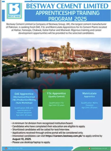 Bestway Cement Limited jobs advertisement dated about 28 July 2025 in daily Jang Newspaper invites application for the vacant post of apprenticeship training program in Chakwal, chakwal Punjab Pakistan. DAE, Matric and Intermediate etc. educational qualification will be preferred.