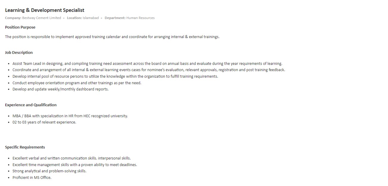Vacant posts including learning development specialist are announced in Bestway Consultancy Services Islamabad, islamabad Islamabad Pakistan as per 7 November 2023 advertisement in daily Other Newspaper. Persons with Bachelor and Master etc. education can apply.
