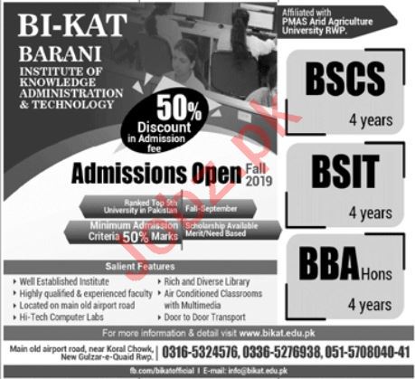 Barani Institute of Knowledge Administration & Technology is offering admissions in BS Computer Science, BS Information Technology, BBA in Rawalpindi. Barani Institute of Knowledge Administration & Technology is affiliated with PMAS Arid Agriculture University Rawalpindi. Read newspaper ad for exact details.