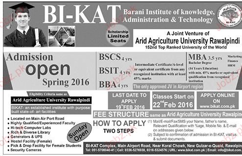 BI-Kat Barani Institute of Knowledge, Administration and Technology Admission in BSCS, BSIT, BBA and MBA in Rawalpindi. Read newspaper ad for exact details.