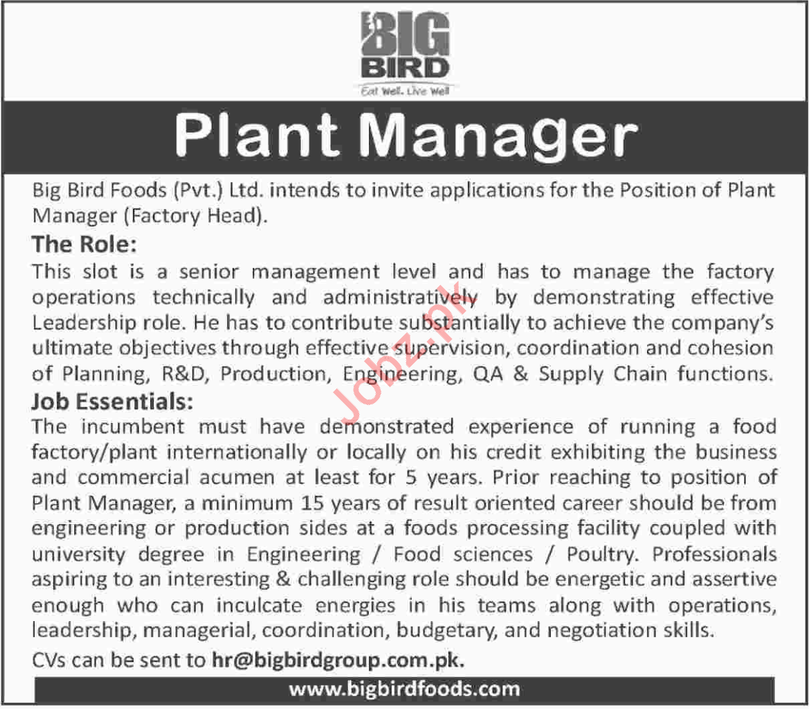 Big Bird Foods Lahore Jobs 2018 For Plant Manager