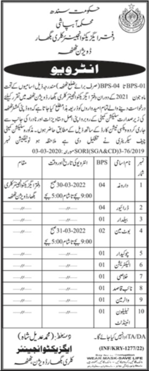 Vacant posts including khalasi, chowkidar, darogha, beldar, telephone operator, driver, boatman, electrician, waterman and naib qasid are announced in Irrigation Department Thatta, thatta Sindh Pakistan as per 13 March 2022 advertisement in daily Jang Newspaper. Persons with Primary and Middle etc. education can apply.