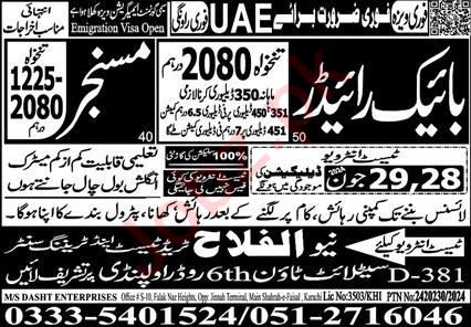 Dasht Enterprises Overseas Employment Promoters Abu Dhabi, dubai UAE invites applications from eligible candidates for the post of messenger and bike rider as per advertisement of June 23, 2024 published in daily Express Newspaper. Preferred Education is Matric etc.