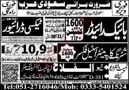 M Pak Makkah Manpower Services jobs advertisement dated about 8 September 2024 in daily Express Newspaper invites application for the vacant post of steel fixer, bike rider, shuttering carpenter and taxi driver in Riyadh, riyadh Saudi Arabia. Educational qualifications required Middle, Matric and Intermediate etc.