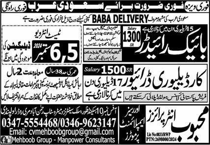 Mehboob Enterprises Overseas Employment Promoters jobs advertisement dated about 3 September 2024 in daily Express Newspaper invites application for the vacant post of driver, car delivery driver, rider, ltv driver and bike rider in Riyadh, al khobar Saudi Arabia. Intermediate and Matric etc. educational qualification will be preferred.