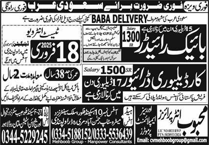 Mehboob Enterprises Overseas Employment Promoters jobs advertisement dated about 11 February 2025 in daily Express Newspaper invites application for the vacant post of driver, car delivery driver and bike rider in Riyadh, tabuk Saudi Arabia. Educational qualifications required Matric and Intermediate etc.