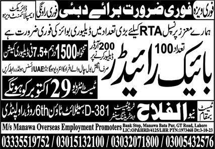 Latest Overseas jobs in Manawan Overseas Employment Promoter in Driving and others can be applied till 29 October 2023 or as per closing date in newspaper ad. Read complete ad online to know how to apply on latest Manawan Overseas Employment Promoter job opportunities. Learn today extra skills including Motorcycle Courier, Courier, Food Delivery and Delivery to get these Manawan Overseas Employment Promoter jobs. Salary varies from 115000. Overtime might be allowed. On job transport, medical and accommodation facility is provided.